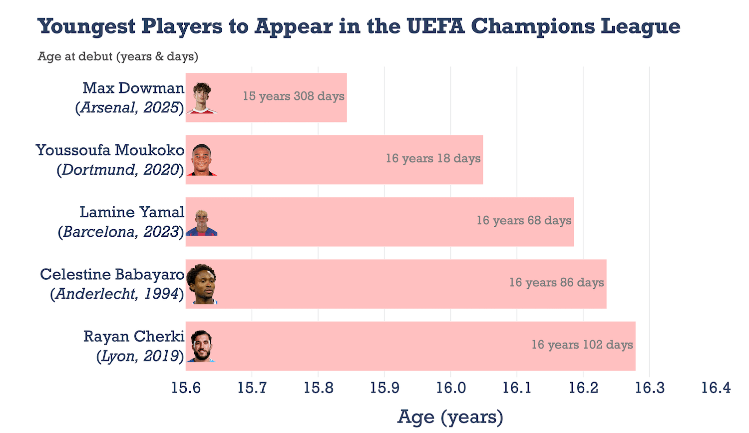 The list is packed with highly promising young talents and at the very top of it we have 15-year-old wonderkid Max Dowman. With extraordinary market growth of 446%, his current €1.3 million valuation is expected to reach around €7.1 million by summer 2026. He impressed in Arsenal pre-season camp and made his senior Arsenal debut in August as the club’s second-youngest first-team player, behind teammate Ethan Nwaneri. Later, he became the youngest player in UEFA Champions League history, playing at 15 years and 308 days in Arsenal’s 3–0 win over Slavia Prague, breaking Youssoufa Moukoko’s record (16 years, 18 days). It’s obvious that Max will be one of the most spoken talents in the upcoming years. Arsenal have reached an agreement with him to sign scholarship terms with a professional contract expected to follow when he turns 17.