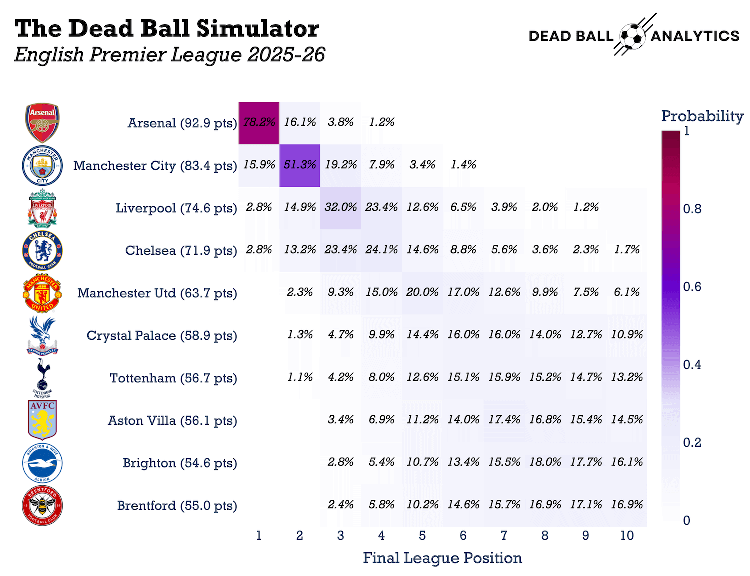 In an era where small margins define everything (title races, European spots, survival), volatility is not noise. It’s the story. At Dead Ball Analytics , we aimed to quantify that chaos. So we turned to The Dead Ball Analytics Simulator, our match-by-match engine that plays the season forward 10,000 times, recalibrating team strength, form and match dynamics after every simulated whistle.