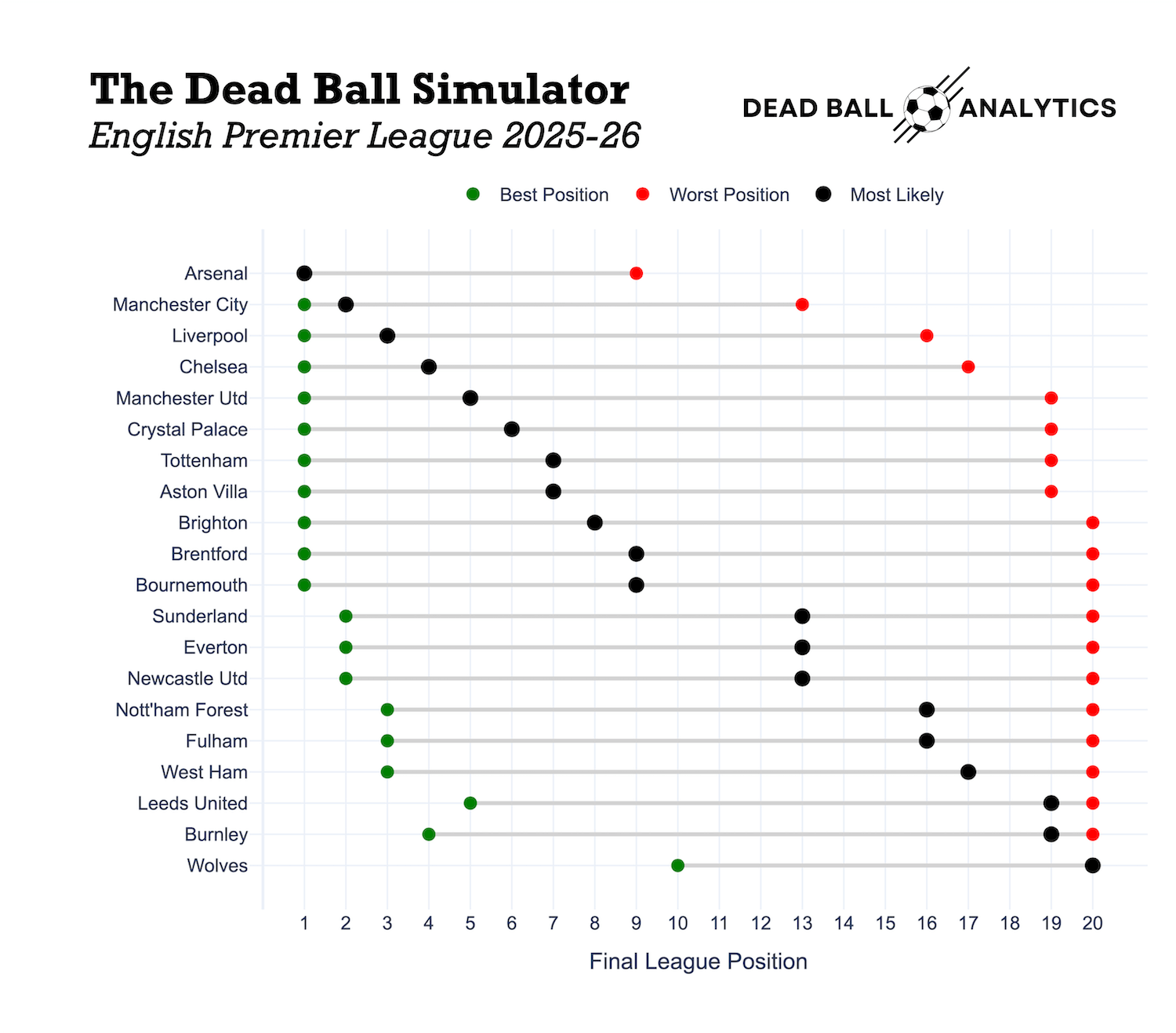 Figure 2: Best, worst, and most likely final positions for each Premier League club in the Dead Ball Simulator