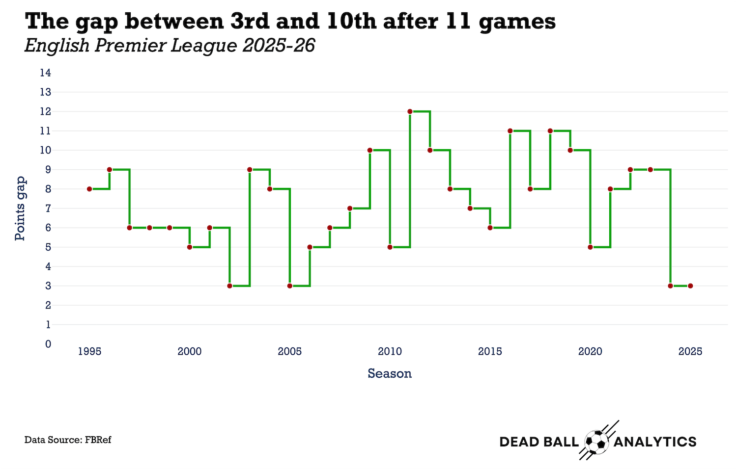 If the Premier League has felt unusually chaotic this season, it’s because it is. The gap between 3rd and 10th after 11 games has never been smaller since records began in the 1995-96 season. The big clubs are wobbling, the pack is suffocatingly close, and the table is shifting week to week like a kaleidoscope.
