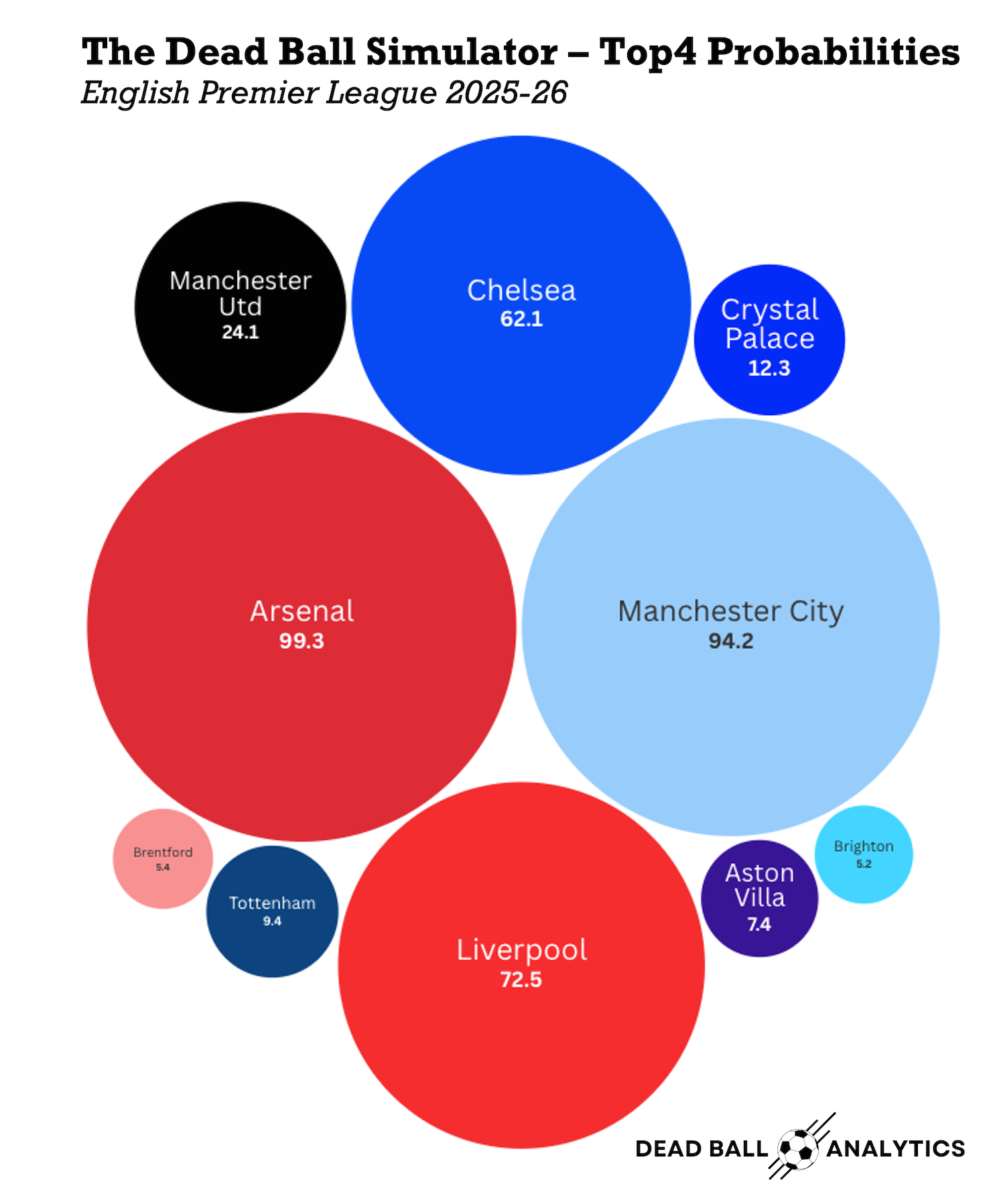 If the bottom half is chaotic, the top half is something else entirely, a collision of ambition, spending power, and tactical identity. And according to The Dead Ball Analytics Simulator, the gaps between these teams are razor-thin in ways the table alone doesn’t reveal.
