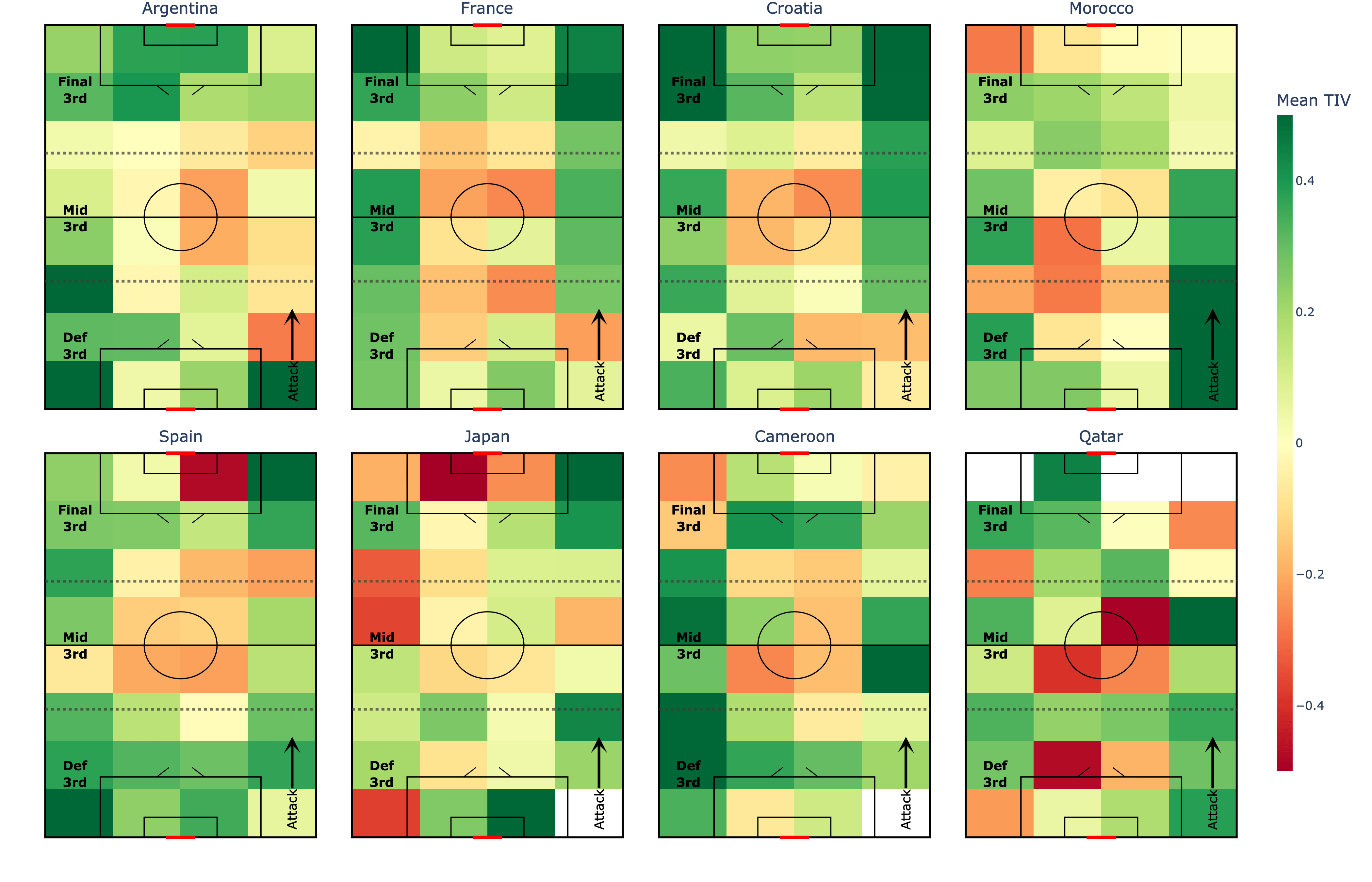 🇦🇷Argentina: The eventual champions showed a remarkable ability to generate high-TIV passes concentrated in advanced central areas of the final third. This reflects their tendency to advance the ball into tight, dangerous pockets between defensive lines, where their creative players (read: Messi) could receive it and create danger. Their impact usually came from playing sharp passes into tight, crowded spaces.