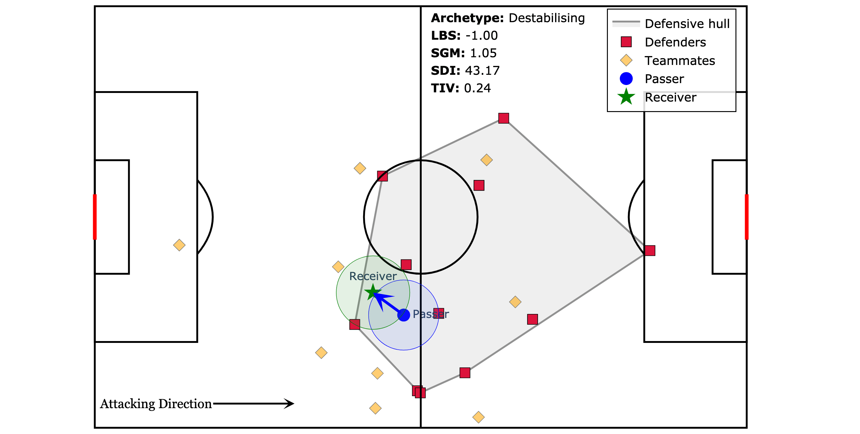 Figure 3: The Destabilising Archetype. A pass that forces the defensive shape to stretch and deform (High SDI) creating structural instability even without bypassing multiple lines.