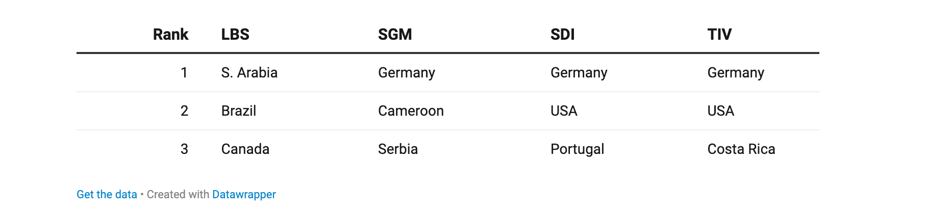 Table 1: Top three teams in the 2022 FIFA World Cup ranked by mean structural passing metrics: Line Bypass Score (LBS), Space Gain Metric (SGM), Structural Disruption Index (SDI), and Tactical Impact Value (TIV). Rankings are based on average values across all passes for each team.