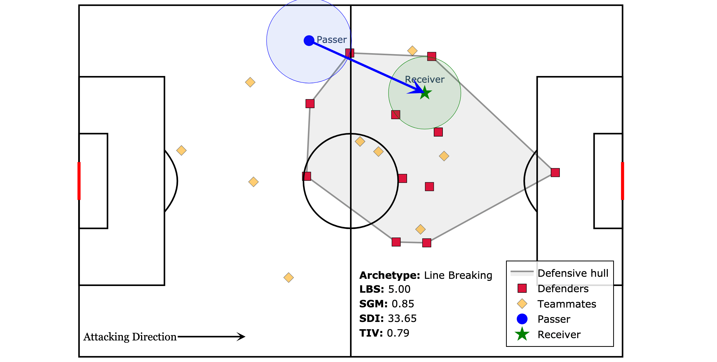 1-Line Bypass Score (LBS): Simply quantifies the number of defenders effectively “taken out” of the play. A defender is bypassed if they are positioned between the passer and the opponent’s goal but end up behind the receiver after the pass.