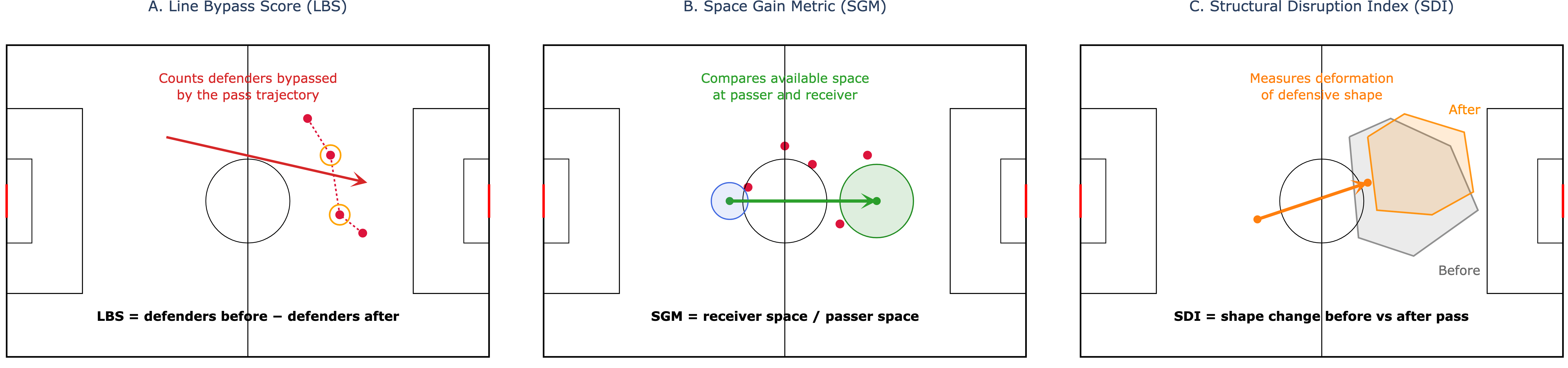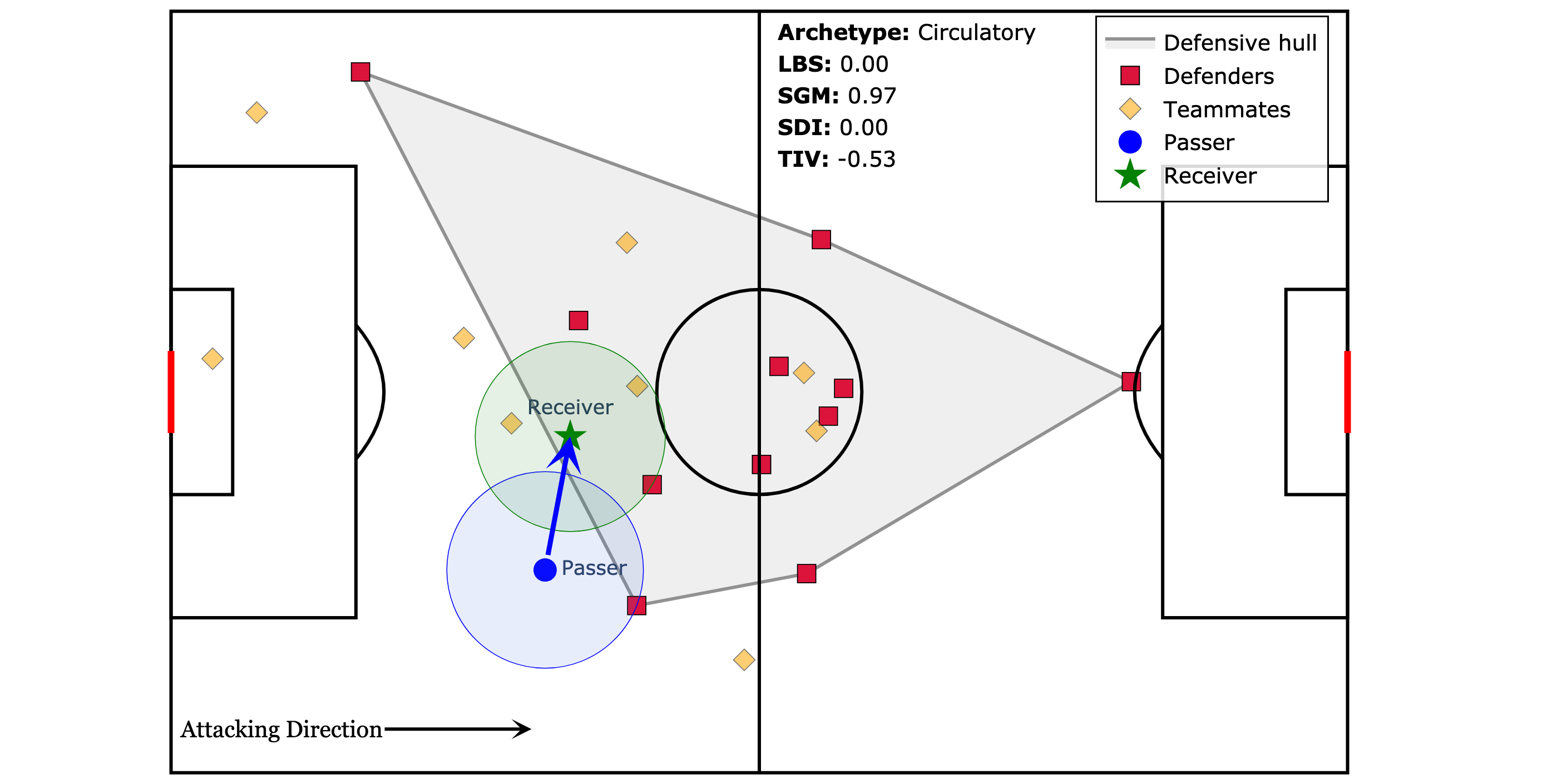 2-Space Gain Metric (SGM): Measures the increase in available attacking space around the receiver compared to the passer’s initial position. This is calculated based on defensive density and the compactness of the defensive block.