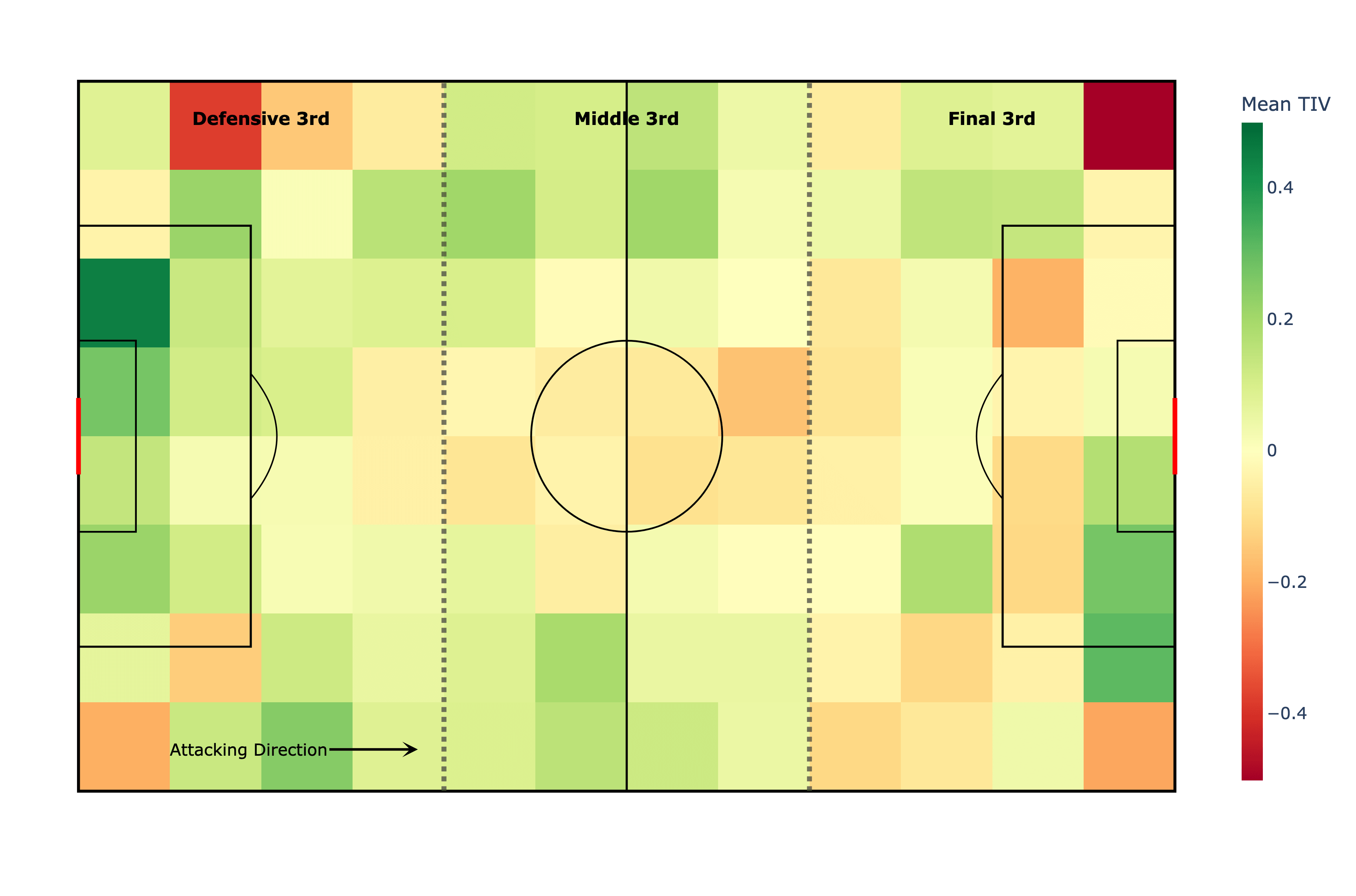 Beyond what kind of passes teams tend to make, where they make them is equally crucial. Our analysis of the spatial distribution of TIV revealed interesting patterns: